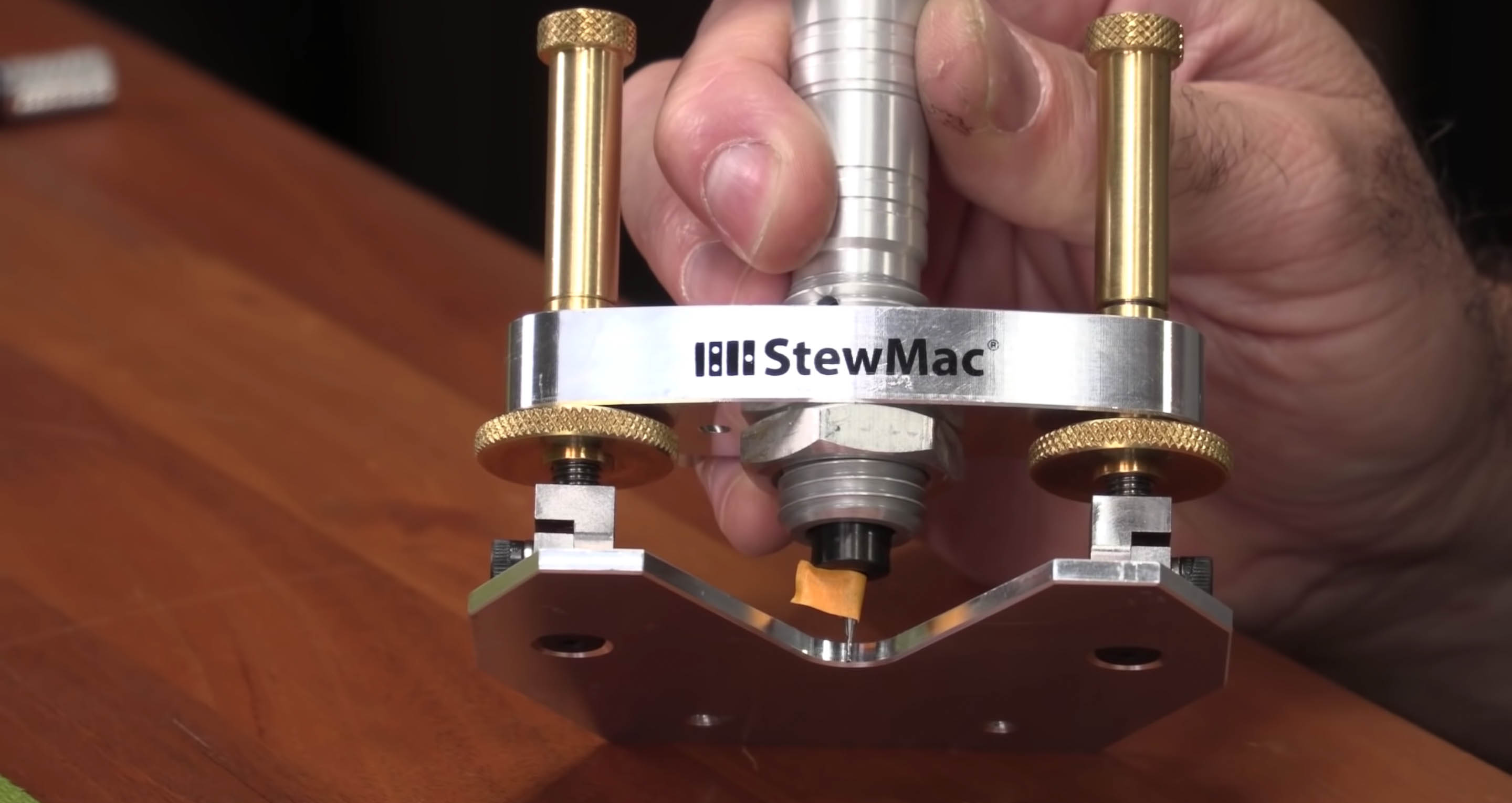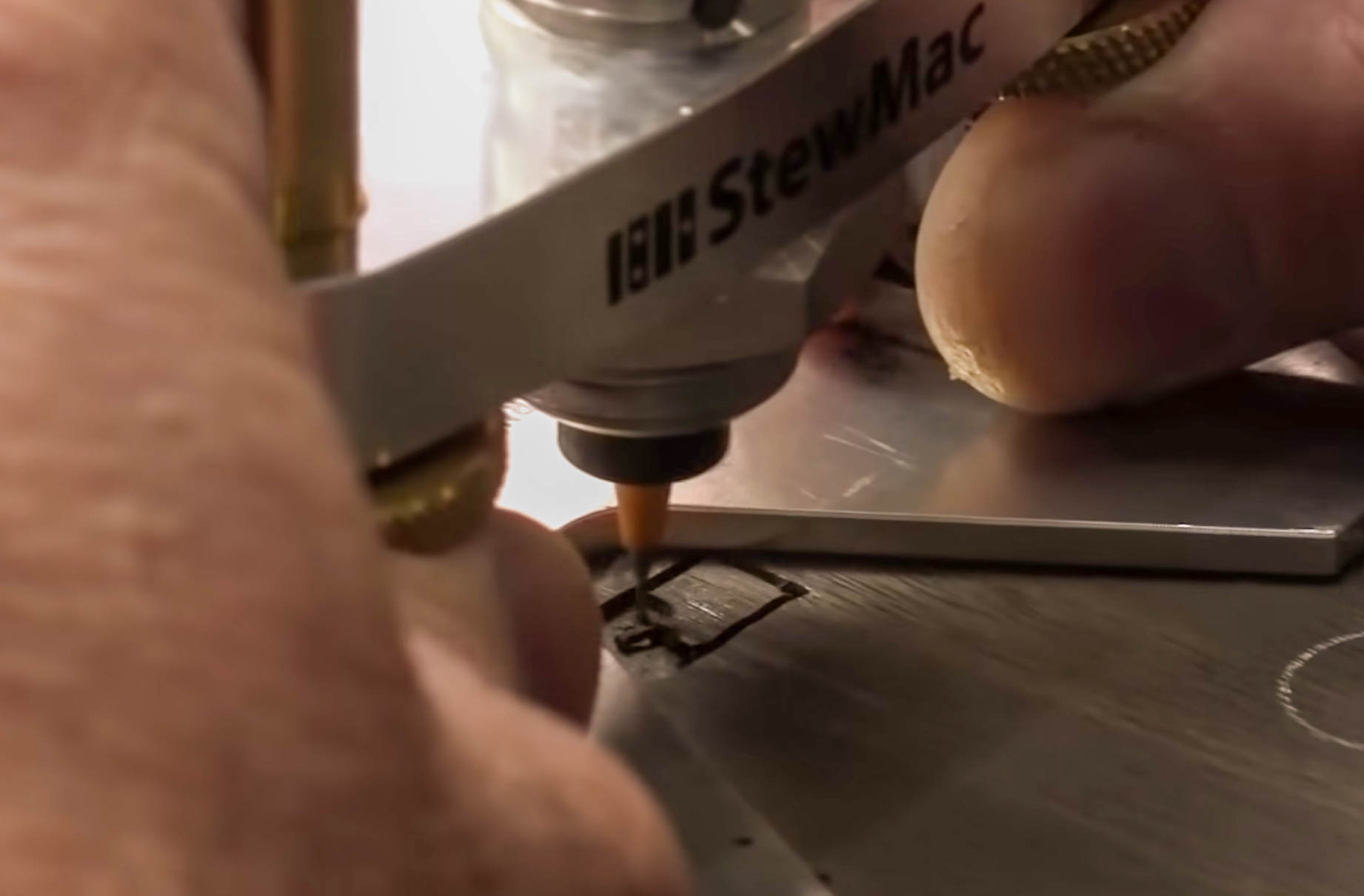 Ruban adhésif doubleJ’ai mon placage de tête en ébène collé à ma table de travail avec du ruban adhésif double face pour qu’il ne bouge pas. Nous utilisons le routeur Foredom avec la base de routeur de précision StewMac, qui est l’un de mes outils préférés. Et nous utilisons les trépans d’incrustation en carbure avec cela. Ils offrent une coupe très résistante et très nette qui ne s’effiloche pas en haut lorsque vous les utilisez, donc elle est très propre.