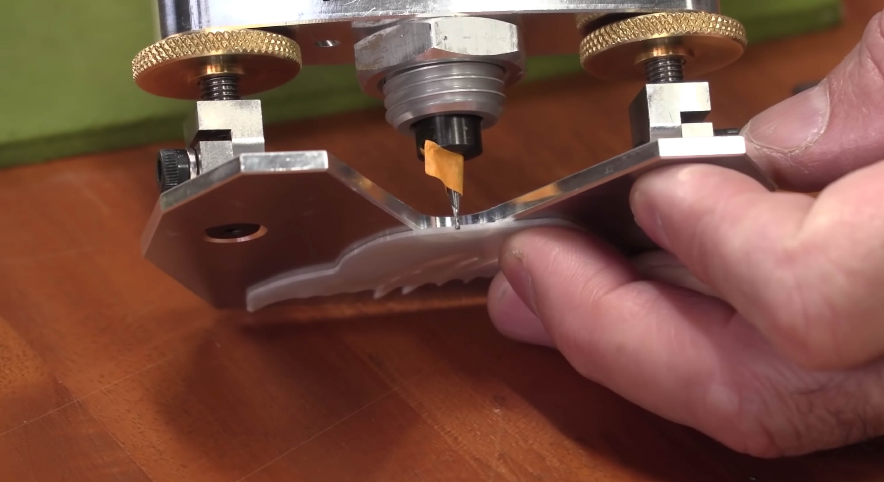 Ensuite, vous allez verrouiller ces vis à oreilles en position. Après cela, vérifiez à nouveau le trépan à côté de la perle, juste pour vous assurer que rien n’a bougé lorsque vous verrouillez les vis à oreilles. Lorsque nous l’avons finalement incrusté, après avoir pris notre temps et fait cela avec soin, la perle doit être placée dans cette poche, surélevée suffisamment pour que vous la sentiez lorsque vous passez votre doigt dessus.