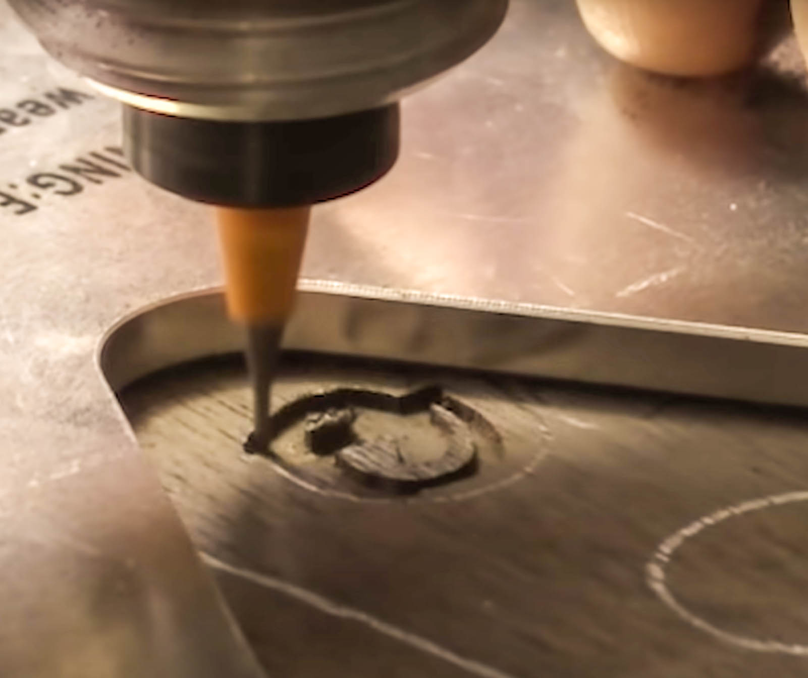 Avant de couper, nous allons utiliser la perle dont nous avons coupé notre logo pour obtenir le morceau exactement là où nous le voulons. Posez très soigneusement la perle sur la base et sentez l’endroit où passe le bit routeur. Si vous prenez une lame de rasoir et que vous la faites passer le long de la perle et qu’elle attrape le trépan, reculez le trépan jusqu’à ce qu’il soit complètement affleurant.