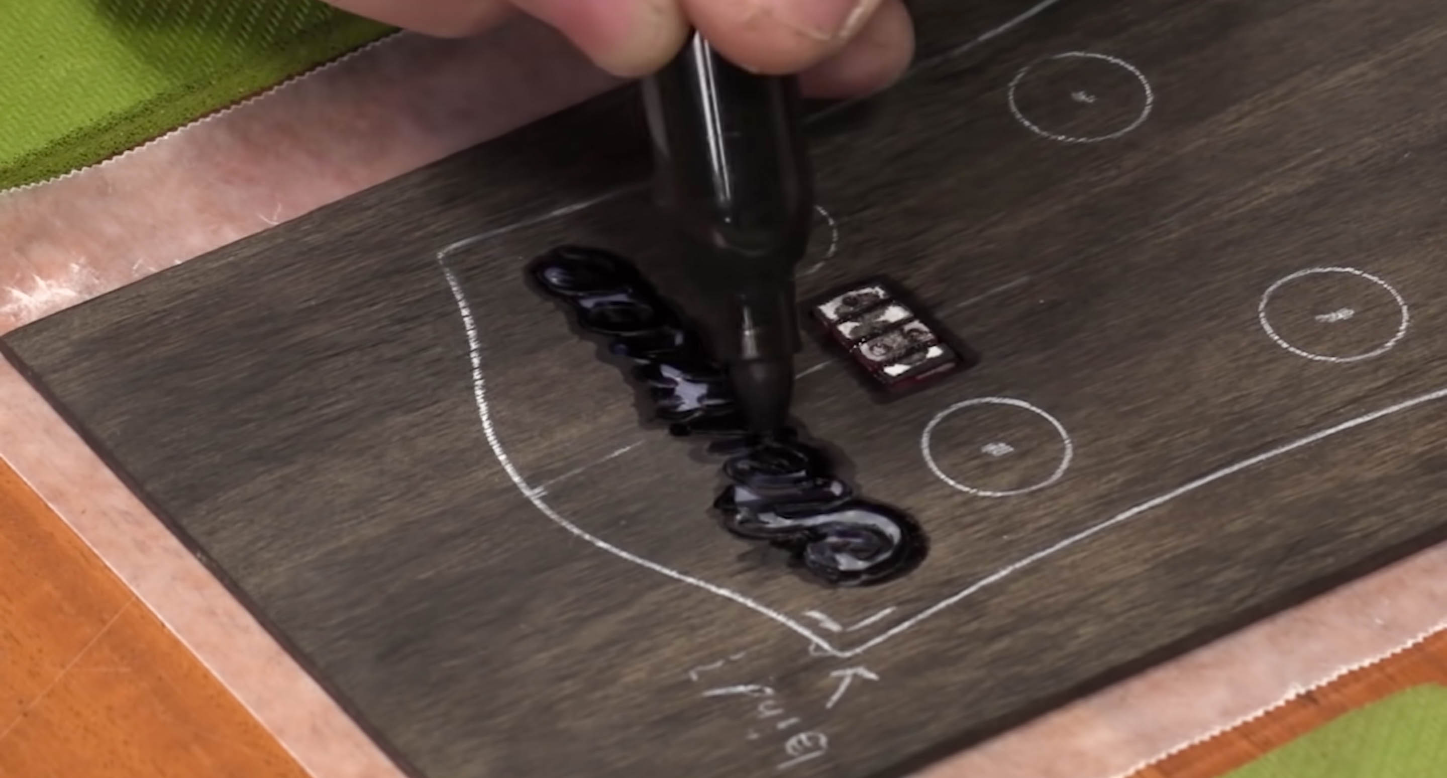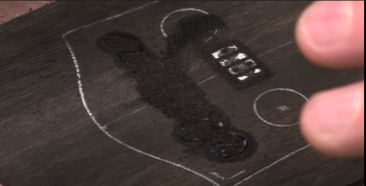 Commencez à tracer et à appuyer doucement sur le bois, en créant une ligne aussi sombre que possible. Nous allons commencer par le logo de la position fret.