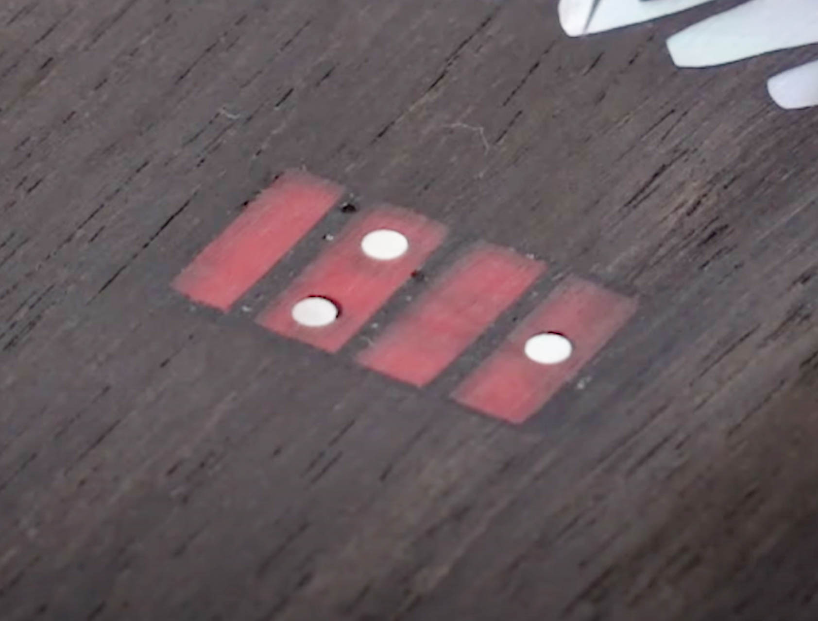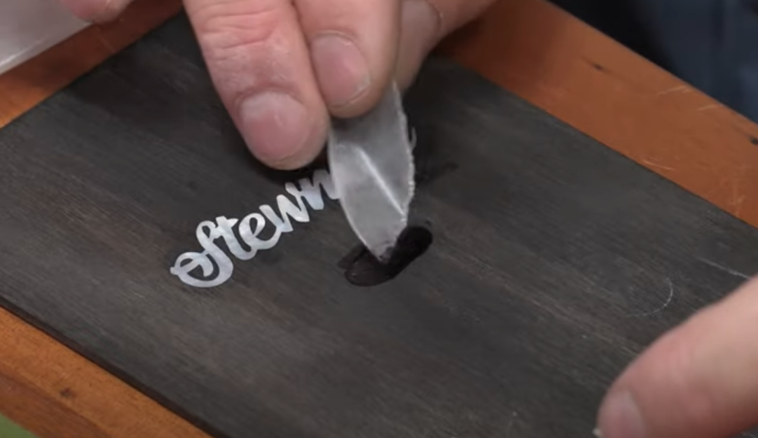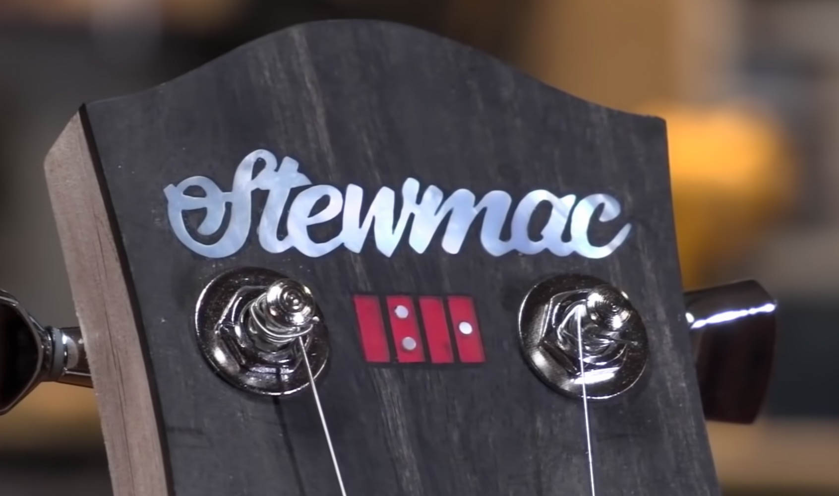 Dans la deuxième partie, nous avons discuté de l’acheminement de la poche dans votre bois, du collage du logo dans cette poche, et du remplissage d’un espace avec de la colle et de la poussière de bois. Pour la démonstration, nous travaillons avec un logo en deux parties. La première partie est le texte du script « StewMac », et la deuxième est ce petit carton rouge, que nous avons découpé dans l’Atlantique rouge, avec de petits points de repère en forme de perle .