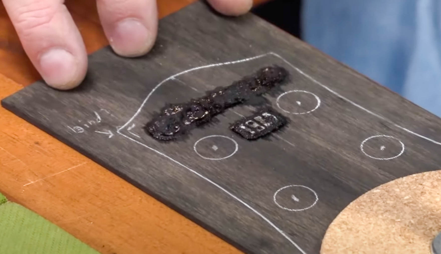 Mais nous n’y sommes pas encore tout à fait. Comme je l’ai mentionné à la fin du dernier article, cette étape, « pré-finition », est la pire que cette incrustation ait jamais vue. Nous avons de la poussière d’ébène, de la colle, un marqueur Sharpie et la colle noire que nous avons utilisée sur le logo en carton, le tout posé sur notre travail.