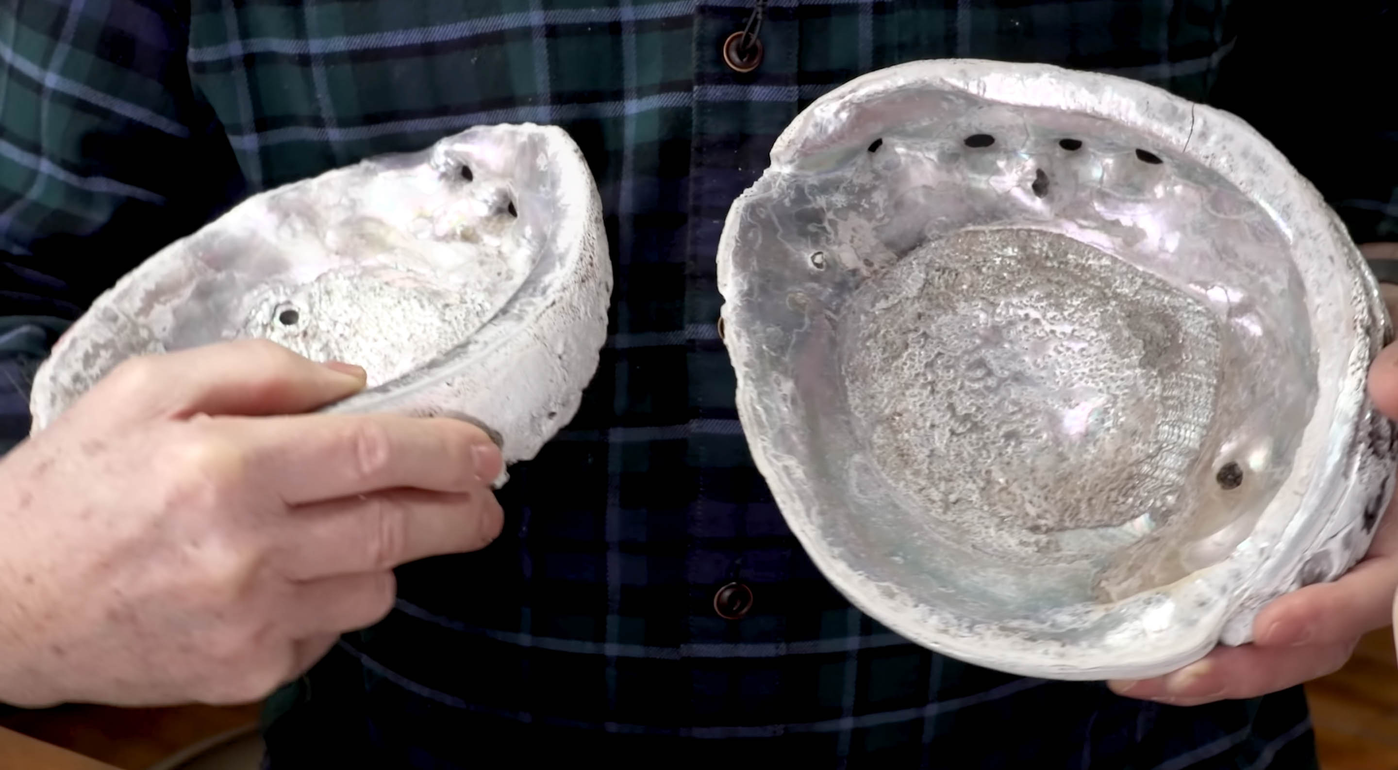 L’Abalone est utilisé depuis des siècles comme matériau d’inlay. Une enveloppe d’ormeau ressemble à ceci. C’est ce que vous verriez dans l’océan, si vous plongiez pour ça. Ils sont très anciens. Ils appartenaient à l’arrière-grand-mère de ma femme.