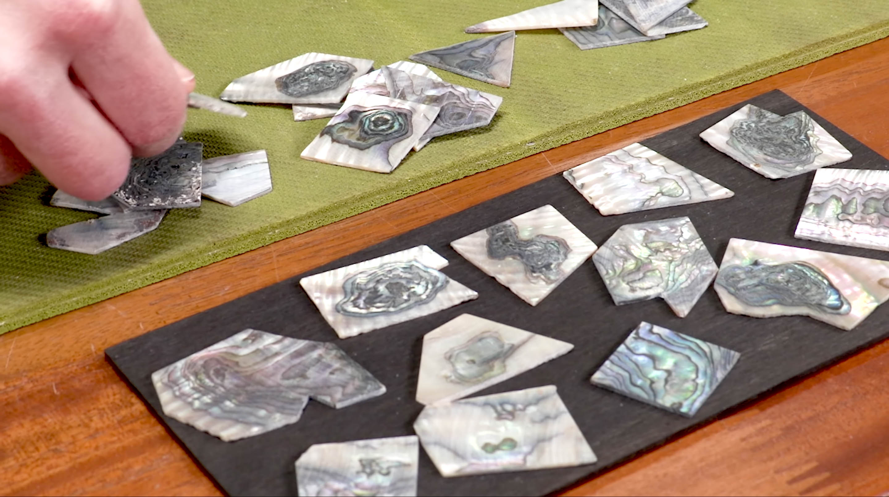Un autre matériau souvent utilisé pour le travail d’incrustation est l’ Abalam. Il s’agit de petits morceaux d’ormeau véritable, compressés dans une matrice. Il semble presque identique à l’orme.