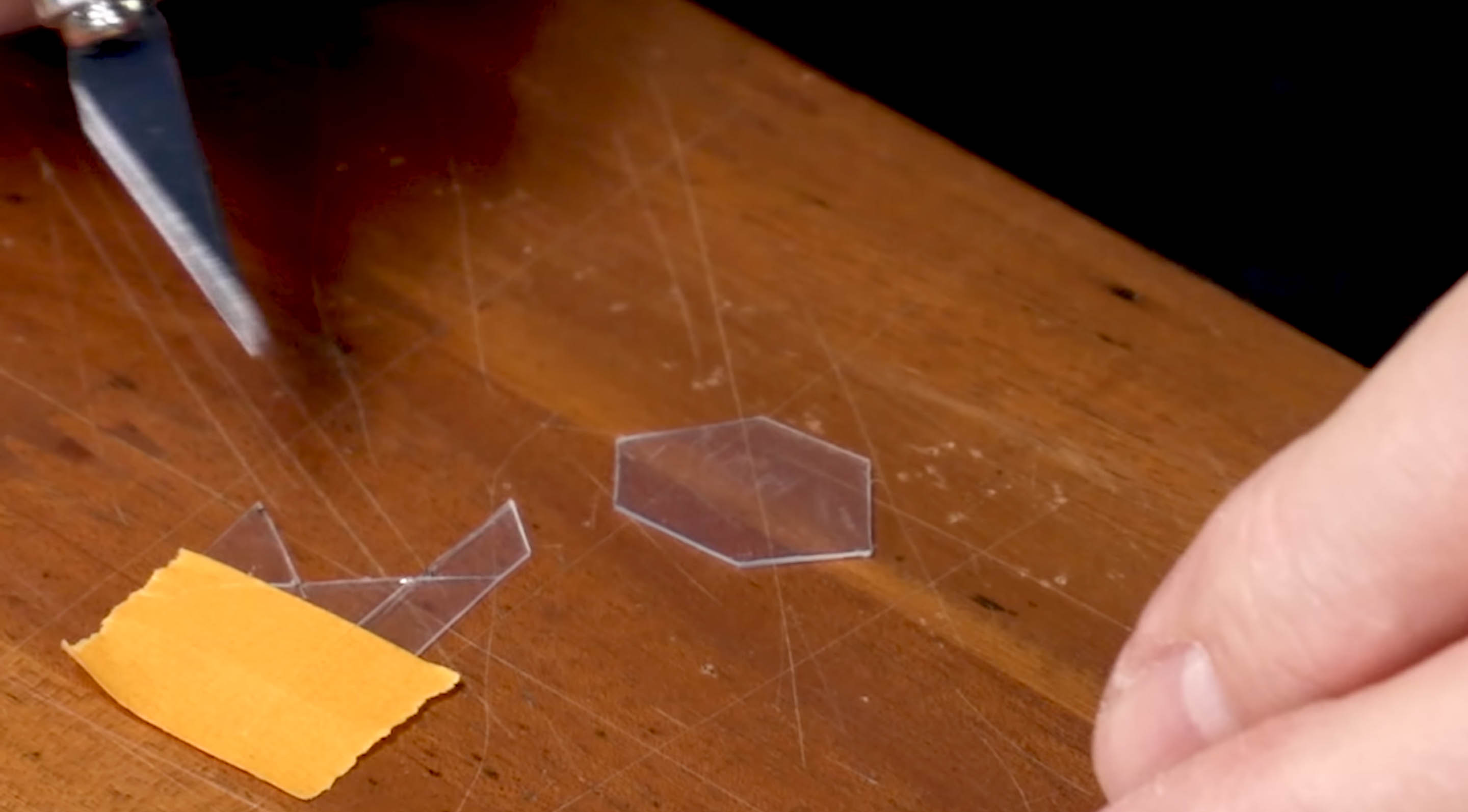 Matériau Pickguard transparentAvant de retirer l’inlay, je veux en faire un petit modèle. Pour mon modèle, j’utiliserai un pickguard en plastique transparent que j’avais allongé dans le magasin. Je vais le coller sur la pièce que nous remplaçons, prendre un scribe inlay, et à chaque coin du design je vais faire une marque.