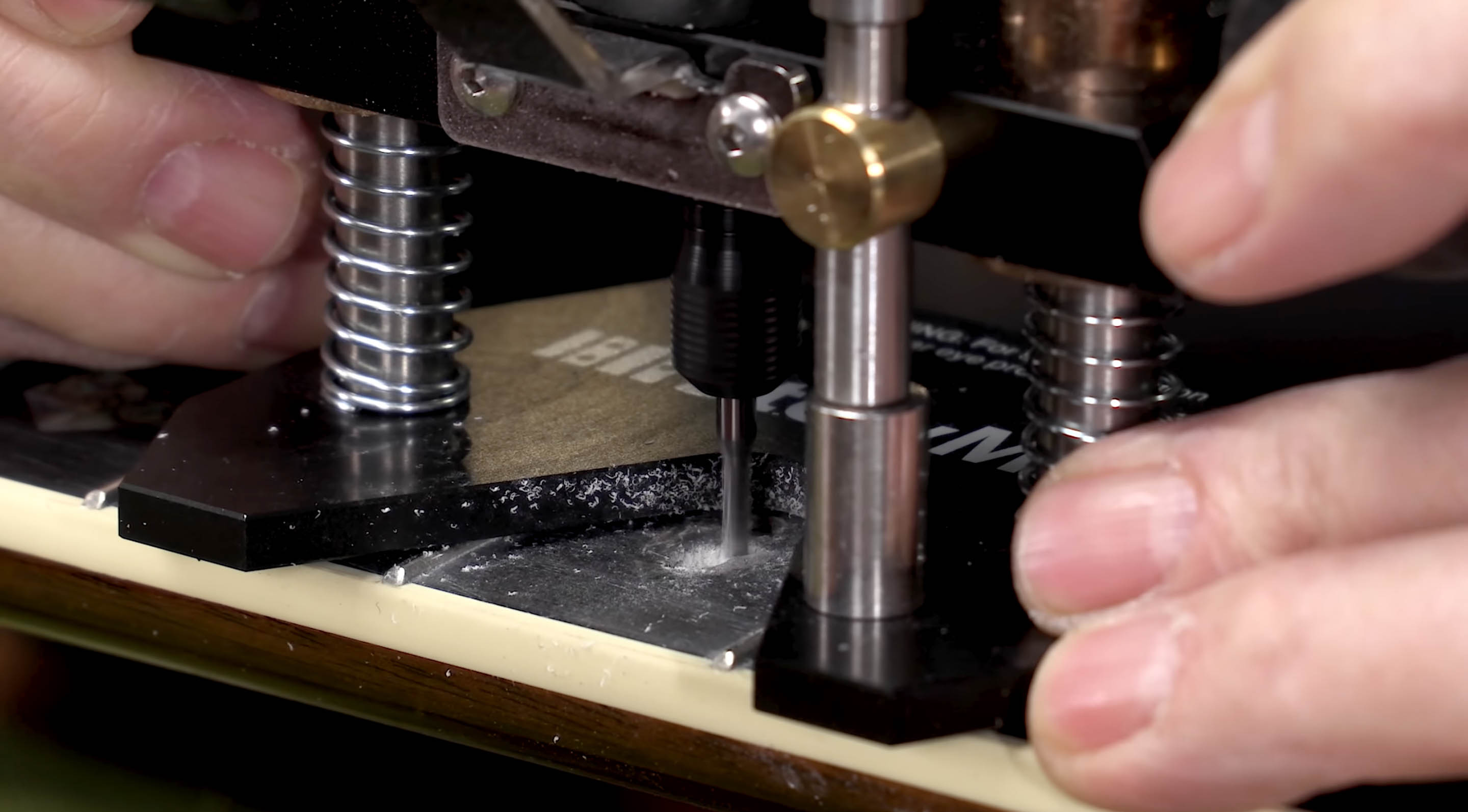 Il s’agit d’un petit gabarit contre lequel couper la perle. StewMac fait un gabarit de découpe de perles sur lequel vous pouvez fixer une pompe à air et souffler légèrement la poussière pendant que vous coupez. Si vous l’utilisez, assurez-vous de porter un respirateur. Vous ne voulez pas respirer la poussière de perle.