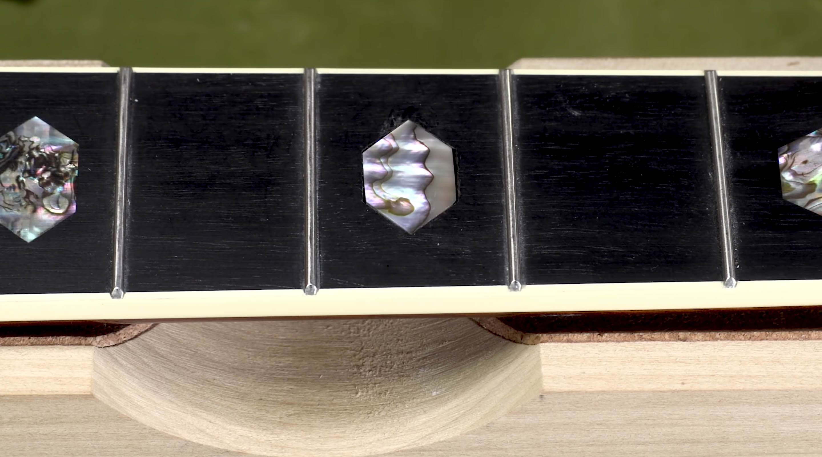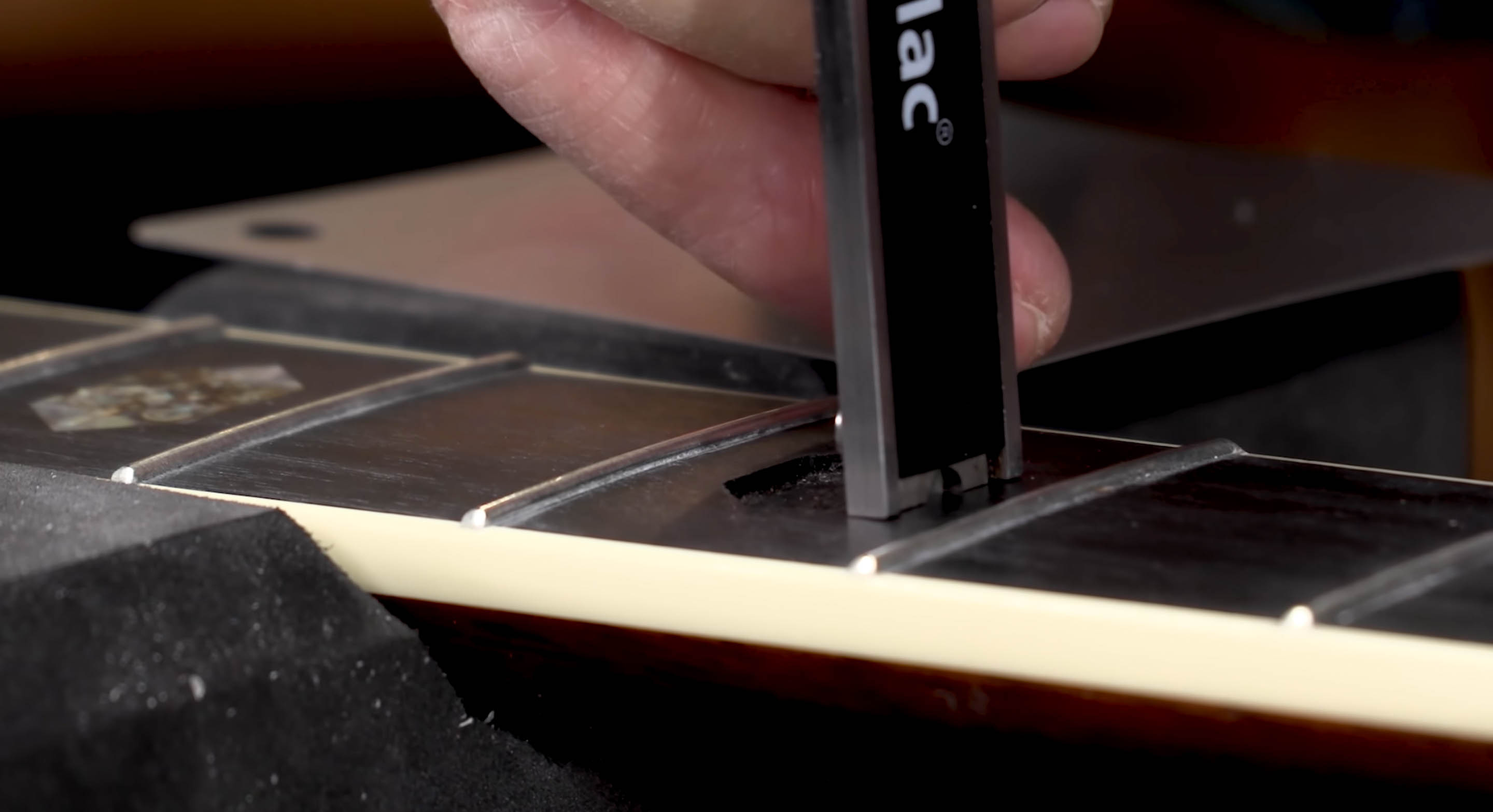 Les blocs de rayon sont utilisés pour poncer les plaques de fret. Si cette guitare était une nouvelle version, ou dans mon magasin pour que tout l’inlay sur le carton soit remplacé, j’utiliserais un grand bloc de rayon pour les poncer tous en même temps. Mais je ne peux pas le faire sur une guitare totalement finie.