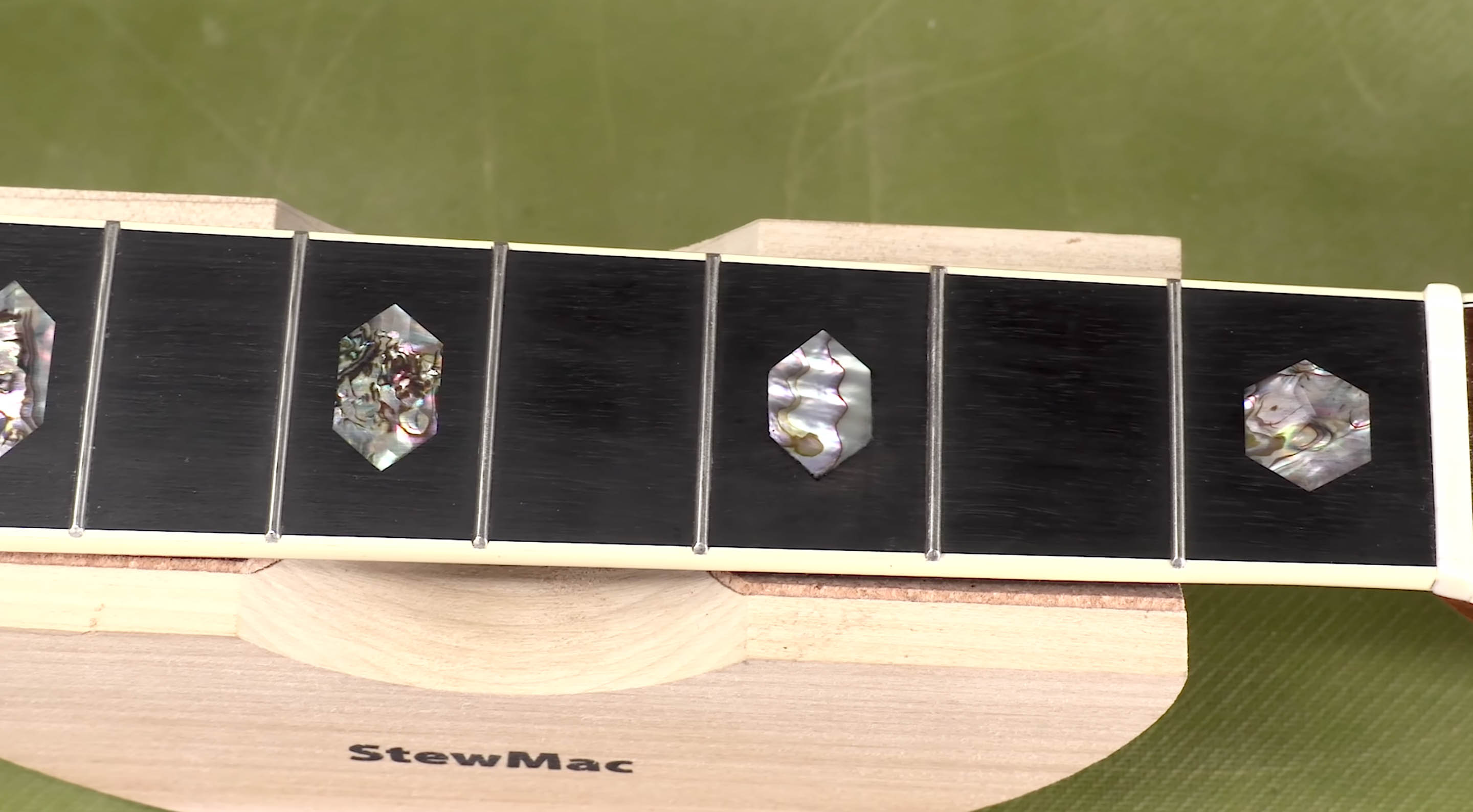 Abalam est agréable à travailler car il est parfaitement plat. L’épaisseur des vraies plaques d’ormeau peut varier légèrement. Ici, ce Martin a, à mon œil, de véritables ormeaux dans toutes les rayures qui s’étendent autour du bord, et sur le logo Martin incrusté sur la tête de manche. Cependant, sur le panneau de fret, certaines de ces inlays sont en ormeau et d’autres sont en abalam. Chez StewMac, nous vendons des paquets d’ ormeau véritable et nous vendons des blancs d’ Abalam.