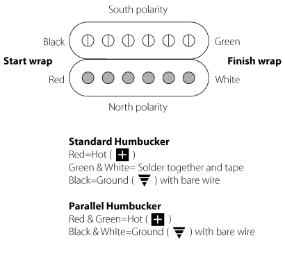 Gibson utilise son propre système de code couleur pour les capteurs à 4 conducteurs. Le schéma ci-dessous montre les bobines et leurs couleurs respectives.