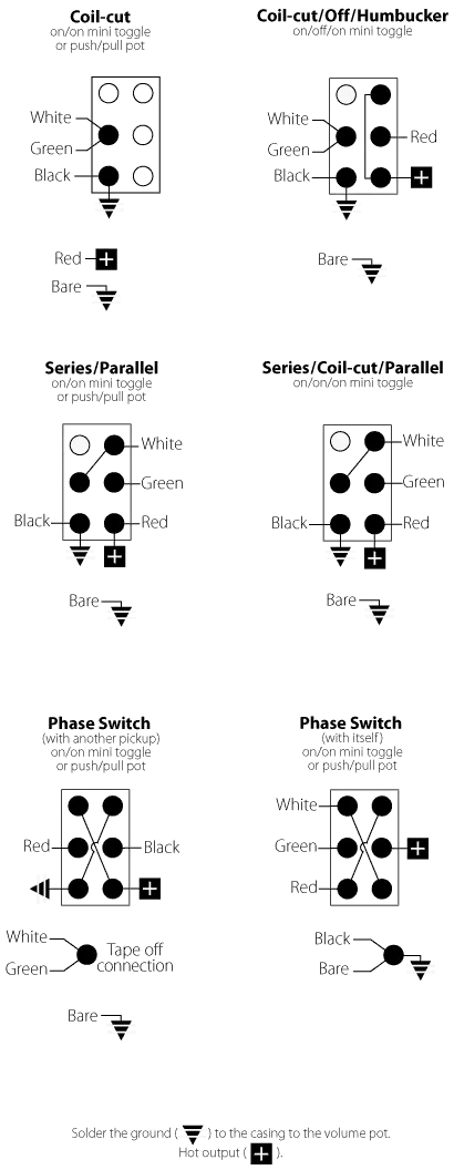 Un humbucker à 4 conducteurs offre de nombreuses options de câblage et de tonalité. Lorsque vous utilisez les options ci-dessous, le fil nu ou blindé est soudé à la « masse » sur le boîtier du réservoir de volume.