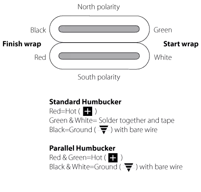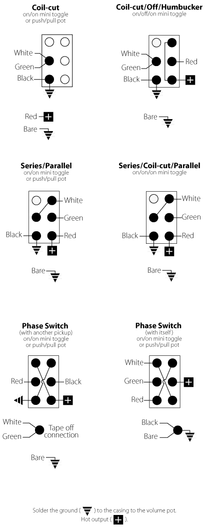 Un humbucker à 4 conducteurs offre de nombreuses options de câblage et de tonalité. Lorsque vous utilisez les options ci-dessous, le fil nu ou blindé est soudé à la « masse » sur le boîtier du réservoir de volume.