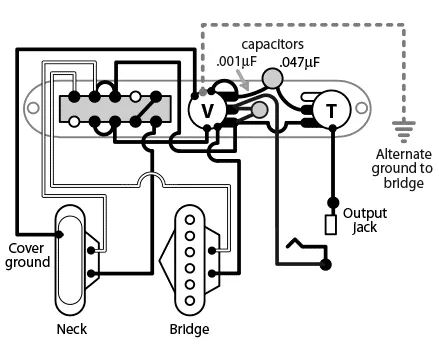 La mise à la terre de la chaîne sur un Tele est généralement effectuée par la plaque de base métallique du pickup de pont en contact avec le pont métallique. Si votre pickup n’a pas de plaque de base métallique, faites passer un fil de terre de chaîne de l’arrière du réservoir de volume à la face inférieure du pont.