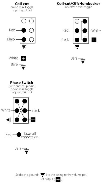 Un humbucker à 4 conducteurs offre de nombreuses options de câblage et de tonalité. Lorsque vous utilisez les options ci-dessous, le fil nu ou blindé est soudé à la « masse » sur le boîtier du potentiomètre de volume.