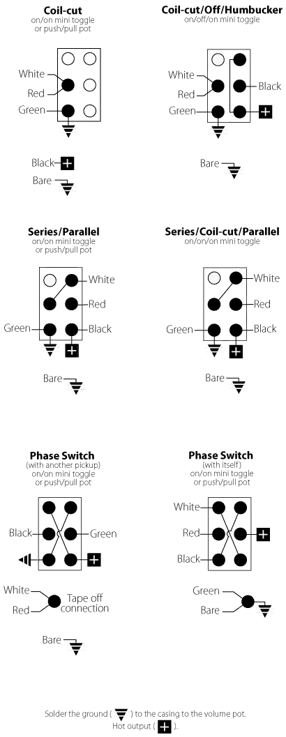 Un humbucker à 4 conducteurs offre de nombreuses options de câblage et de tonalité. Lorsque vous utilisez les options ci-dessous, le fil nu ou blindé est soudé à la « masse » sur le boîtier du réservoir de volume.