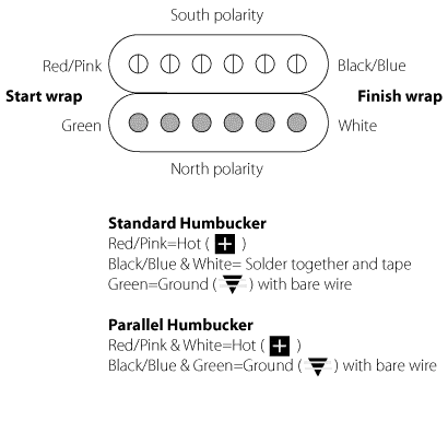 Schémas de câblage et codes couleur pour les capteurs Humbucking WD/Kent Armstrong.