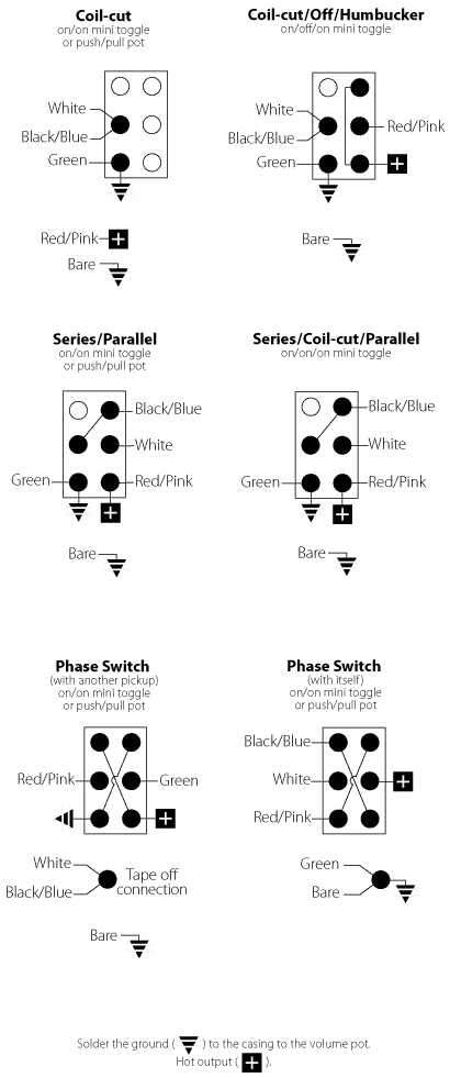 Un humbucker à 4 conducteurs offre de nombreuses options de câblage et de tonalité. Lorsque vous utilisez les options ci-dessous, le fil nu ou blindé est soudé à la « masse » sur le boîtier du réservoir de volume.