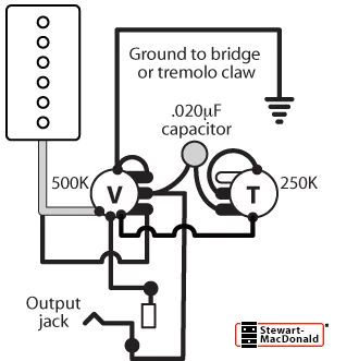 Les kits de câblage Stewart-MacDonald contiennent des fil non câble avec gaine noirs et blancs, ainsi qu’un câble coaxial câble avec gaine . Un fil noir supplémentaire est inclus pour faire passer une chaîne de mise à la terre vers le pont.