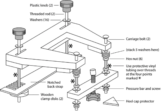 Assemblez le gabarit comme indiqué sur le schéma. Le tube en vinyle s'adapte sur les tiges filetées et les boulons de carrosserie afin que ces pièces métalliques ne rayent pas la finition de la guitare. Chaque boulon de carrosserie est maintenu fermement dans la base en contreplaqué à l'aide de cinq rondelles et d'un écrou hexagonal. Les autres écrous hexagonaux permettent de régler la barre qui maintient la vis de pression.