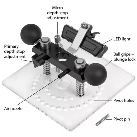 En appuyant sur l’un des trous de la plaque de base sur l’axe de pivotement, le routeur fonctionne comme une boussole. Il tourne autour de la broche, en coupant un cercle précis.