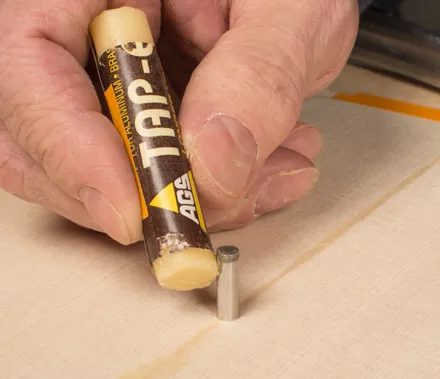 Placez le haut de la guitare sur la broche, en le posant à plat sur le plan de travail en contreplaqué. Les trous de mesure à la base du gabarit sont bien ajustés sur l’axe de pivotement. Lubrifier l’extrémité de la broche avec du lubrifiant de coupe Tap-Ease ou de la cire pour une rotation en douceur.